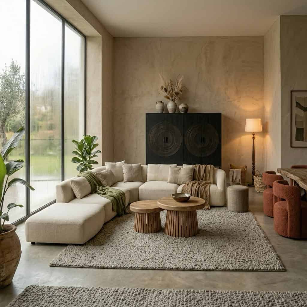 Organische Sofas super zu natürlichen Materialien wie Holz und Wohnaccessoires in sanften Farbtönen. Dazu passen runde Couchtische und Teppiche mit organischen Mustern, die das Gesamtbild abrunden.
