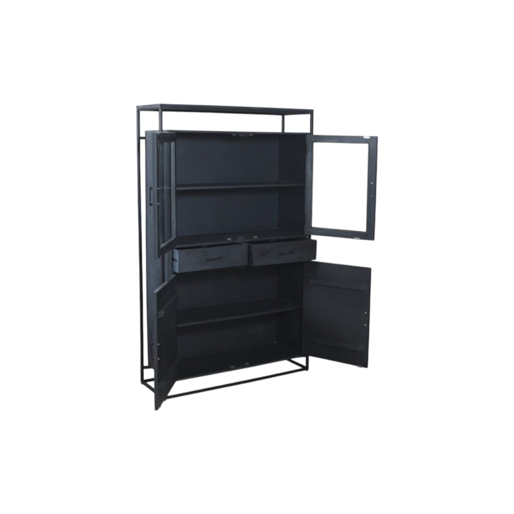 De kast beschikt over twee lades en vier deuren, wat zorgt voor voldoende opbergruimte voor servies, woonaccessoires of andere spullen. Het open metalen frame geeft de kast een luchtige en ruimtelijke uitstraling, ideaal voor zowel grote als compacte ruimtes.
