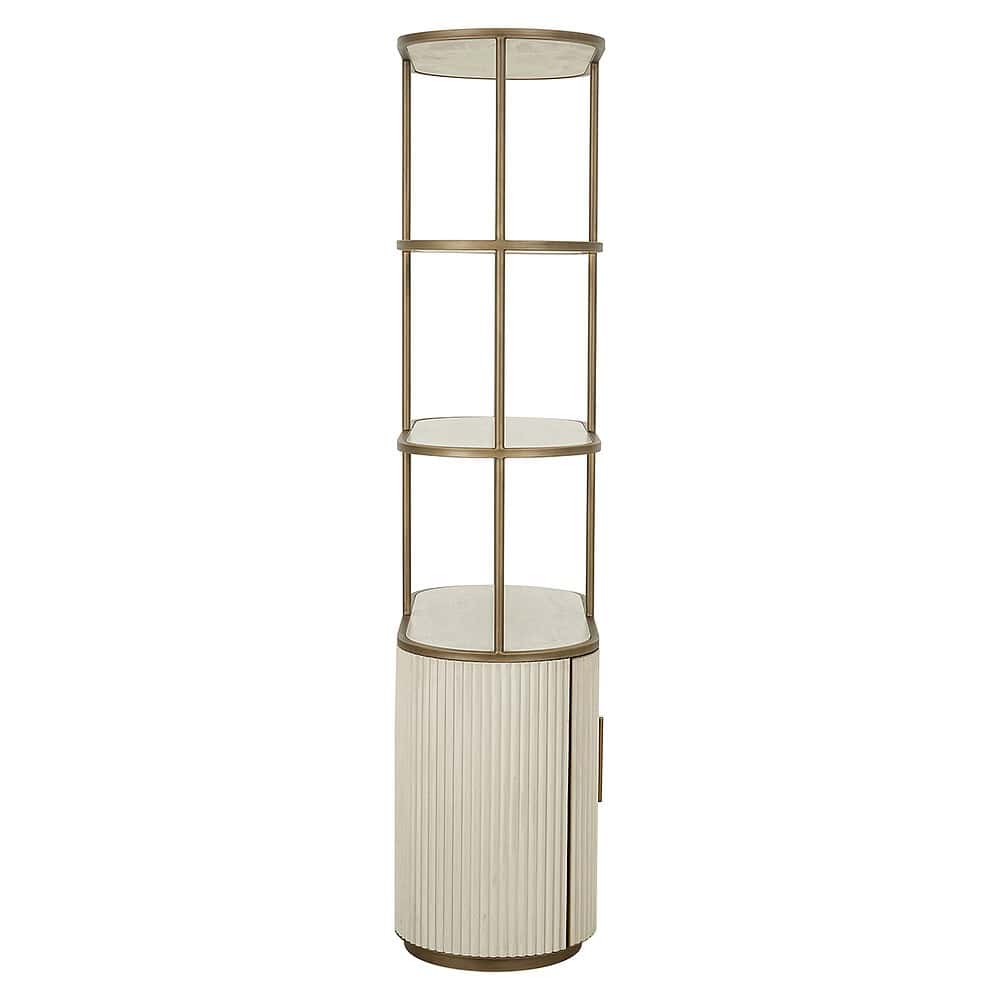 **Luxe materialen en afwerking:** Een metalen frame met een warme, antieke brass finish en een textuur op de kastdeuren voor extra stijl.