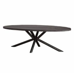Ontdek de perfecte aanvulling voor je eetkamer met deze stijlvolle ovale tafel. Het donkere hout van het tafelblad straalt een moderne elegantie uit, terwijl de subtiele houtnerf een natuurlijke charme toevoegt. De unieke basis met cilindrische poten die samenkomen in een opvallend ontwerp, zorgt niet alleen voor stabiliteit maar ook voor een echte blikvanger in je interieur.