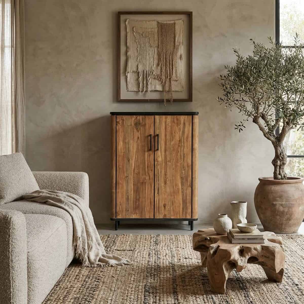 Massief teakhouten meubelen met schuifdeuren en een warme, industriële uitstraling: