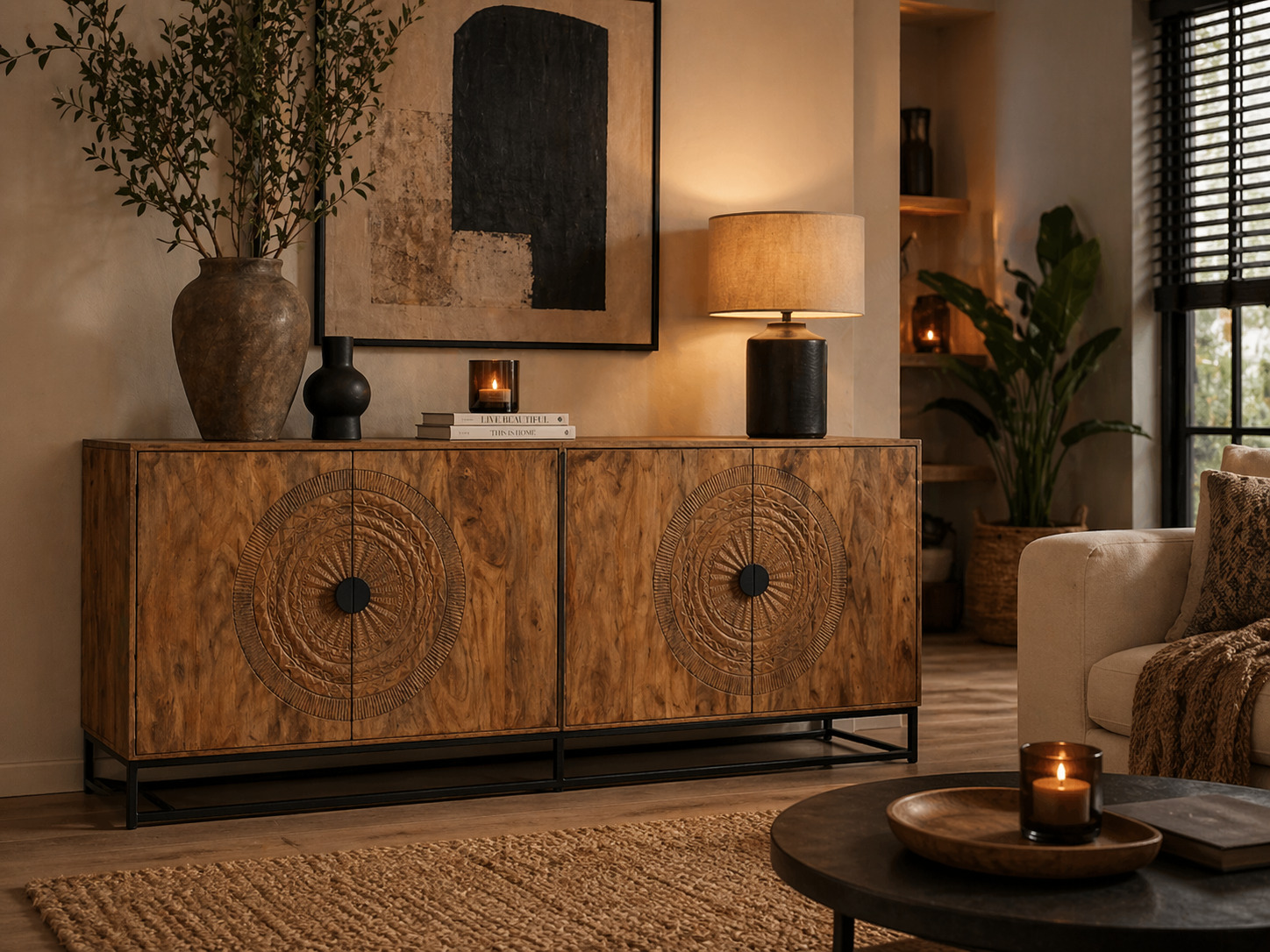 Woonserie Casina combineert handgesneden mandala-motieven met antiek zwart mangohout en metalen accenten voor een artistieke en industriële uitstraling.