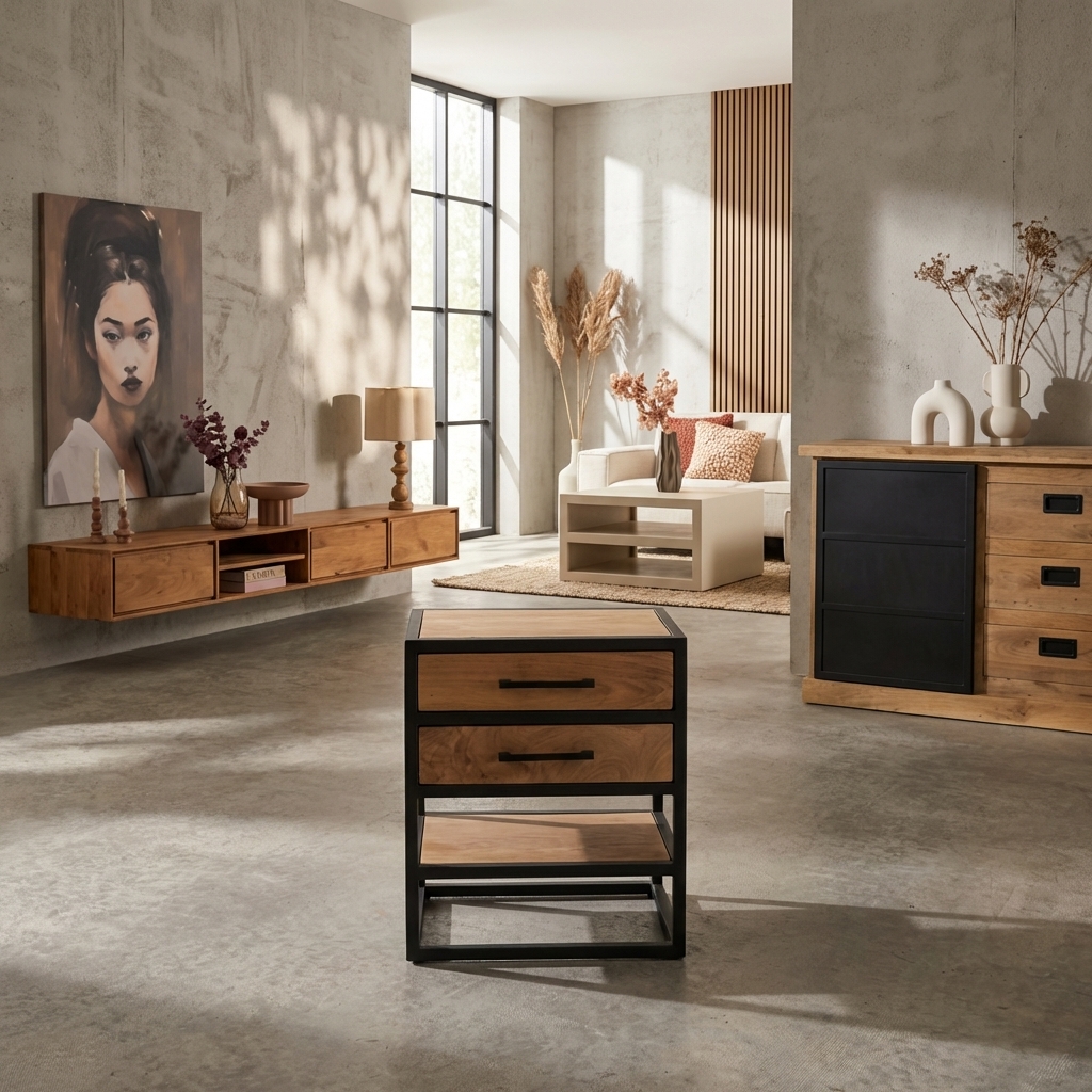 • Modern interieur — de strakke lijnen van het metalen frame en de greeploze handgrepen geven de Dakota serie een moderne uitstraling. In een witte of lichtgrijze woonkamer laat het mangohout zich optimaal zien. Combineer met een bank in lichtgrijs of warm beige en keramische accessoires.