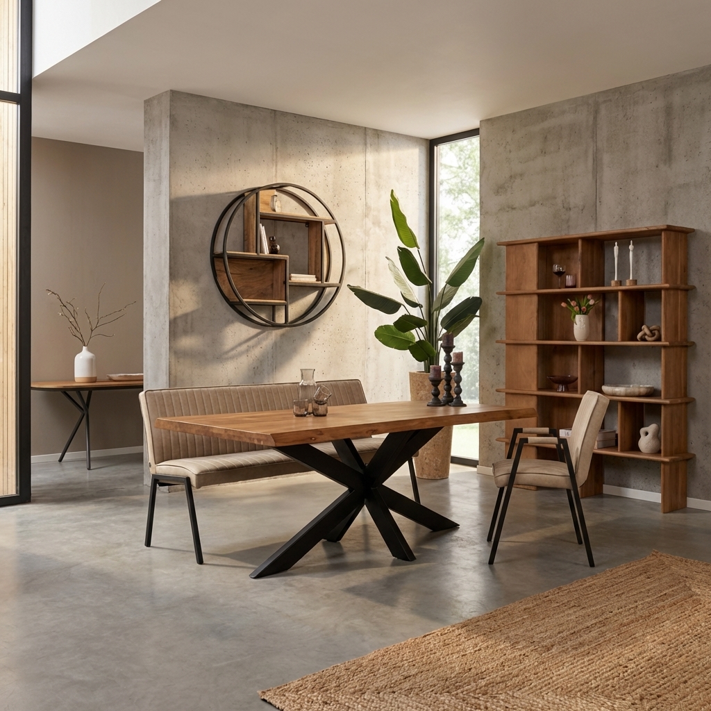 • Dakota eettafel (240 cm, rechthoek) — gemaakt van massief mangohout met een lichte finish, op een zwart gelakt matrixonderstel. De karakteristieke matrixpoot — een strak metalen frame met kruisverbindingen — geeft de tafel een eigentijdse, licht industriële uitstraling. Afmetingen: 240 × 100 × 76 cm, ideaal voor 8 personen.