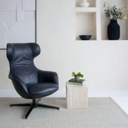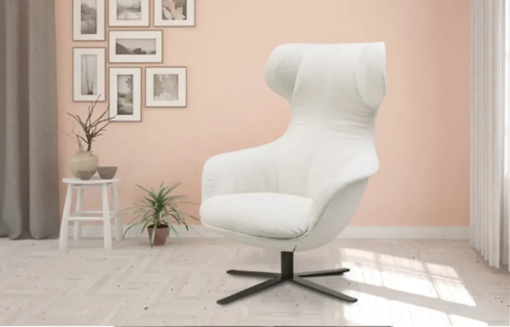 Moderne fauteuil Peaches van Nederlandse fabrikaat het Anker is te herkennen aan zijn moderne design en comfortabel zitcomfort. Peaches is voorzien van een zwarte draaipoot. De fauteuil kan ook met een hocker besteld worden voor extra comfort.
