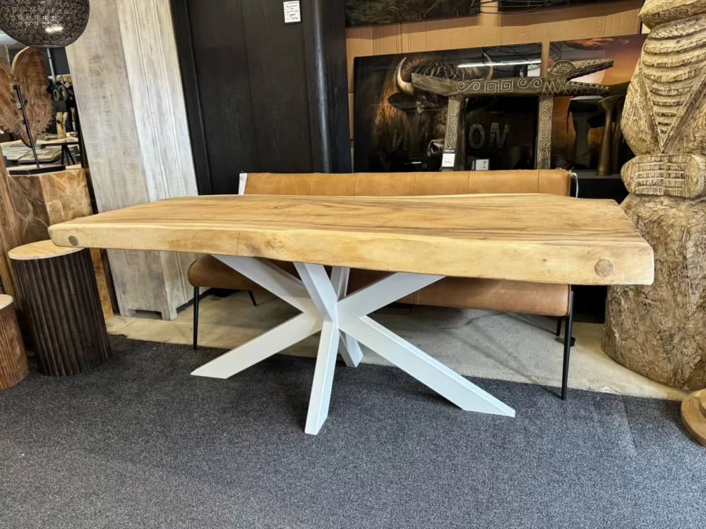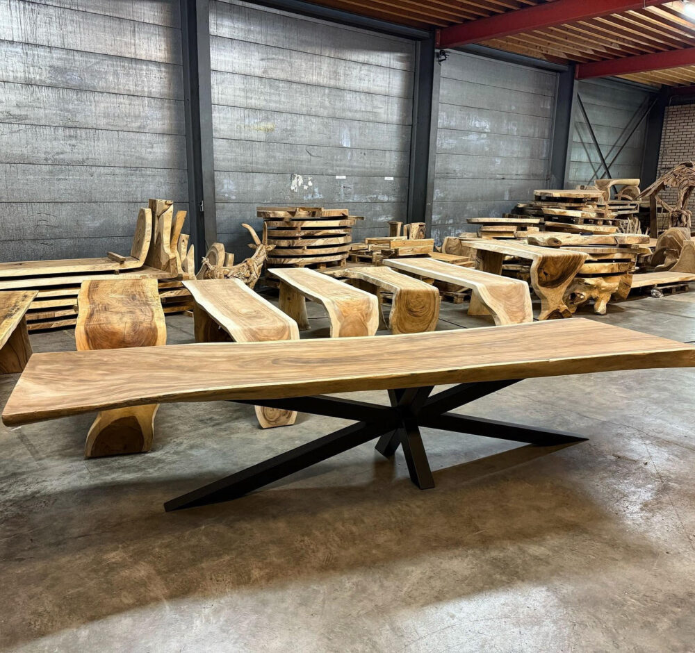 Moderne boomstamtafel uitgevoerd in massief suarhout. Door zijn opvallende bronzen V-poot is de tafel een echte eye-catcher. Met extra keuze uit een witte, of zwarte metalen V-poot is deze robuuste tafel passend te maken voor diverse woonstijlen. Daarnaast is het een optie de tafel een beschermlaag te geven, waardoor deze geschikt is voor buiten gebruik. Een unieke tuintafel of prachtige toevoeging aan uw eetkamer.