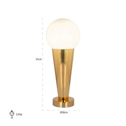 Met zijn slanke, kegelvormige voet van gepolijst metaal straalt deze lamp een luxe en tijdloze charme uit. De gouden finish vangt het licht prachtig op en voegt een warme gloed toe aan je kamer. Bovenop de voet rust een grote, ronde kap van wit glas, die zorgt voor een zachte en gelijkmatige verspreiding van het licht. Hierdoor creëer je een gezellige, warme sfeer in elke kamer.
