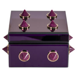 De box is versierd met meerdere kegelvormige studs die een gedurfde, punkachtige uitstraling geven. Deze studs zijn omlijst met gouden ringen voor een luxe touch.